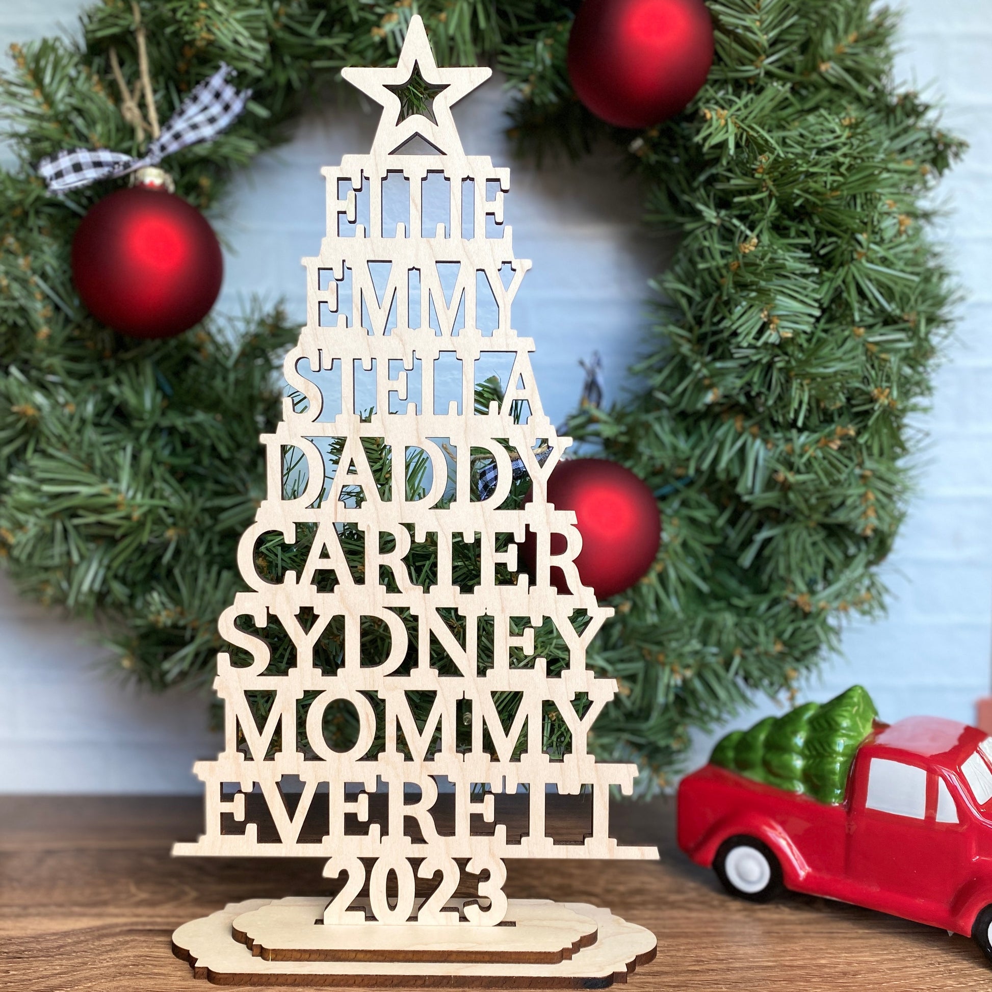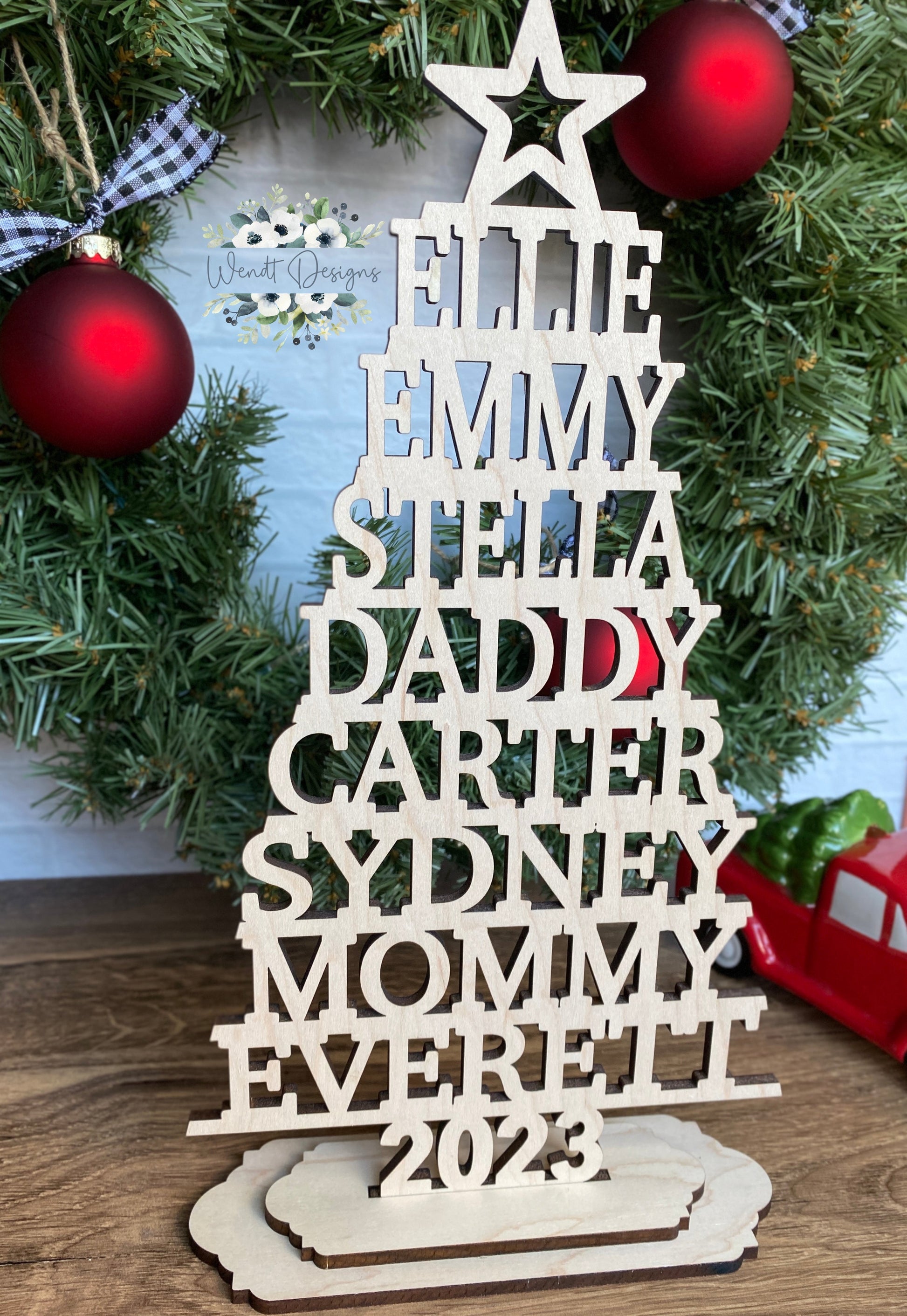 Each display fits up to 8 names and includes your choice of a solid “trunk” or 2023 at the base.